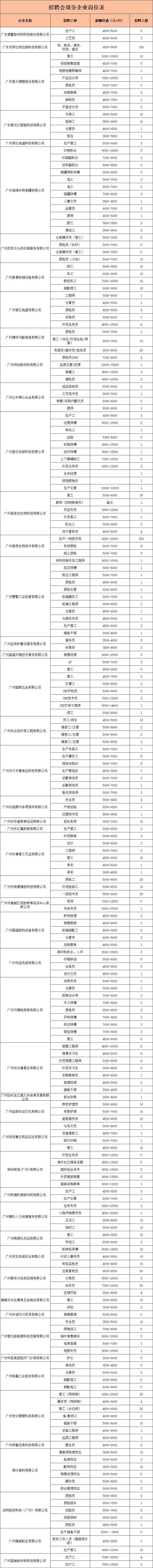 本次招聘会汇集了希美克(广州)实业有限公司、广州和新实业有限公司、广东金铝轻合金股份有限公司、广州世达橡塑科技有限公司、广东泗海印铁制罐有限公司等优质企业,提供众多岗位给求职者选择。