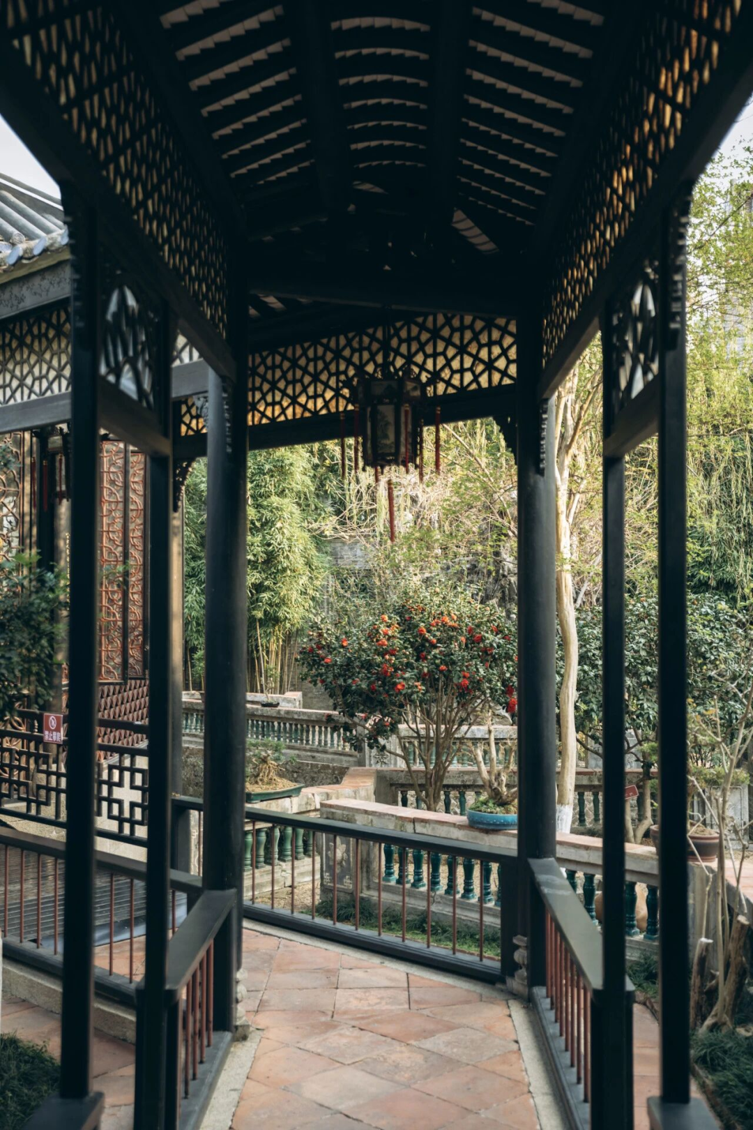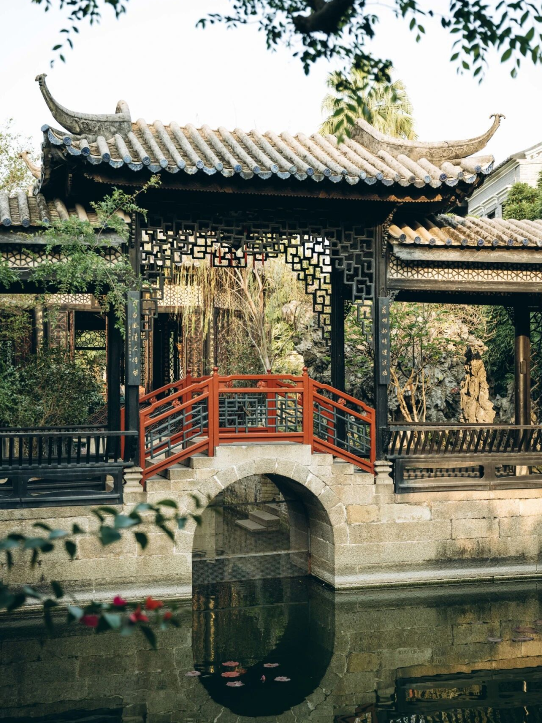 余荫山房环水建园,采用回廊将布局巧妙把建筑和景点串联起来。一屋一瓦、一亭一院、一花一草、一杯一盏都经过精细考量,富有古典的诗意。